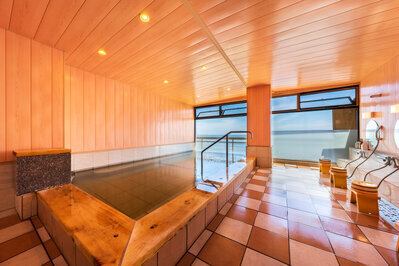大きな窓の向こうに広がるオーシャンビューのお風呂。海沿いをお散歩しながら向かう道中も気持ちいいですよ♪
