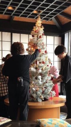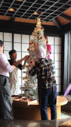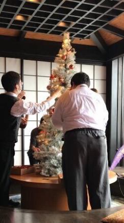 クリスマスツリーを出したら、自然と集まるスタッフたち。